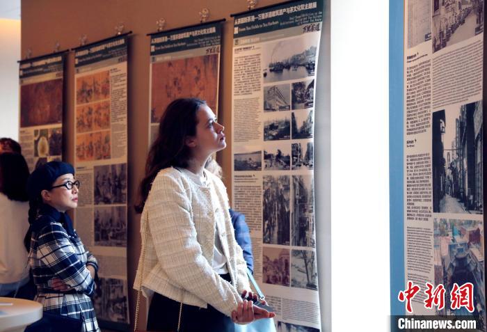 当地时间6月23日,“从茶园到茶港——万里茶道建筑遗产与茶文化双主题展”在莫斯科中国贸易中心举行。图为俄罗斯青年学生参观展览。